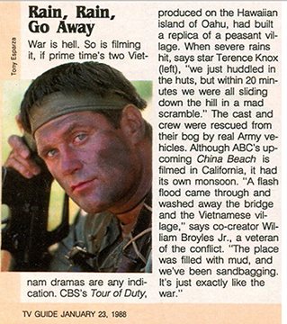 War is hell. So is filming it, if primetime's two Vietnam dramas are any indication. CBS's Tour of Duty, produced on the Hawaiian island of Oahu, had built a replica of a peasant village. When severe rains hit, says star Terence Knox (left), "We just huddled in the huts, but within 20 minutes we were all sliding down the hill in a mad scramble."